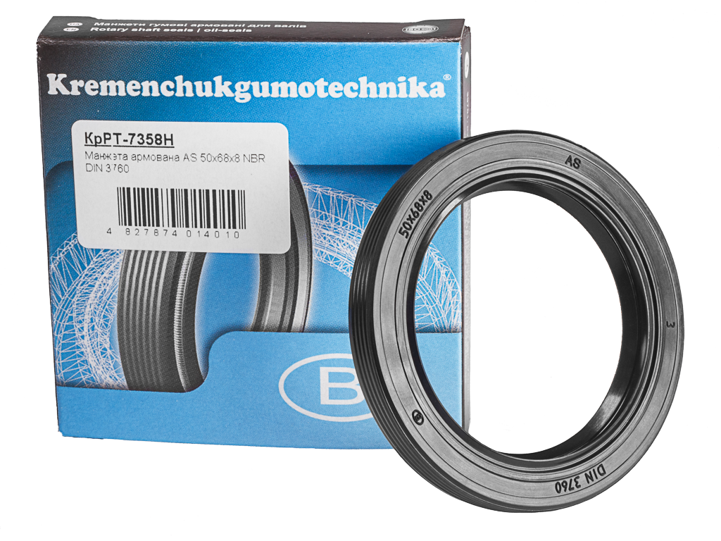Обрезиненная конструкция уплотнения вала с размерами 50х68х8 AS по DIN 3760 или 2.1 по ГОСТ 8752-79 (современный аналог исполнения 2.2) является стандартизированной и подходит как для промышленного оборудования, так и в качестве запчастей для автомобилей, сельхозтехники.